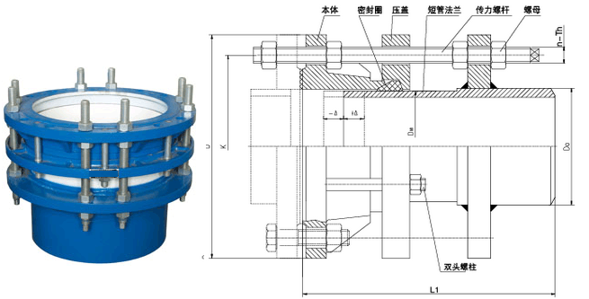 松套传力接头是在法兰松套补偿接头的基础上増设法兰短管及传力螺杆而成,此类型的补偿接头与松套补偿接头和松套限位补偿接头不同的是它的补偿量是指在安装及拆卸过程中的调节量,一旦将所有的螺母拧紧,它是刚性连接的,可以传递轴心力,从而保护阀门、泵等设备。