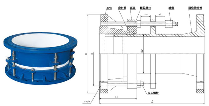 一、性能待点 法兰松套限位补偿接头是在AF型法兰松套补偿接头的基础上増设限位伸缩管及限位螺柱而成,最大伸缩量处用双螺母锁定,补偿因热胀冷缩和地基沉降引起的管线轴向位移及挠曲和偏心,从而保护阀门的设备。根据连接方式的不同分为单法兰松割限位补偿接头和双法兰松套限位补偿接头。