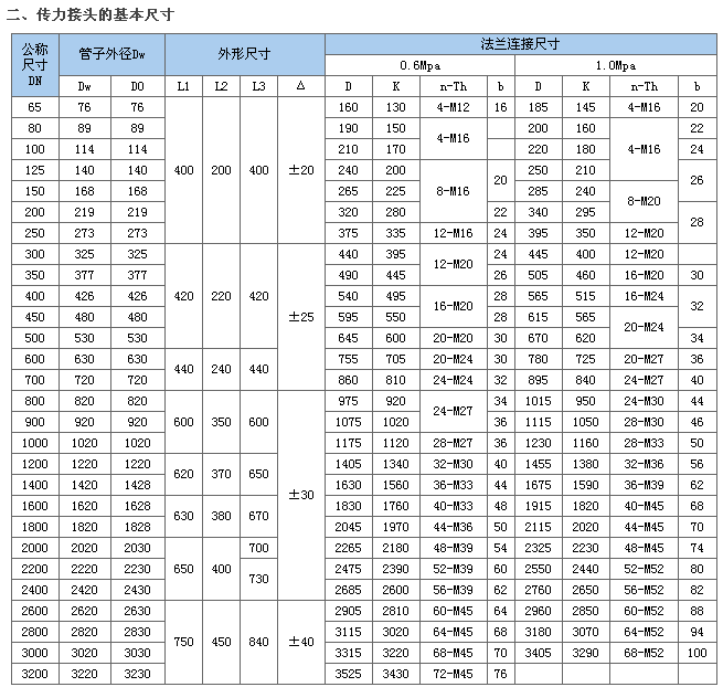 一、性能待点 松套传力接头是在法兰松套补偿接头的基础上増设法兰短管及传力螺杆而成,此类型的补偿接头与松套补偿接头和松套限位补偿接头不同的是它的补偿量是指在安装及拆卸过程中的调节量,一旦将所有的螺母拧紧,它是刚性连接的,可以传递轴心力,从而保护阀门、泵等设备。