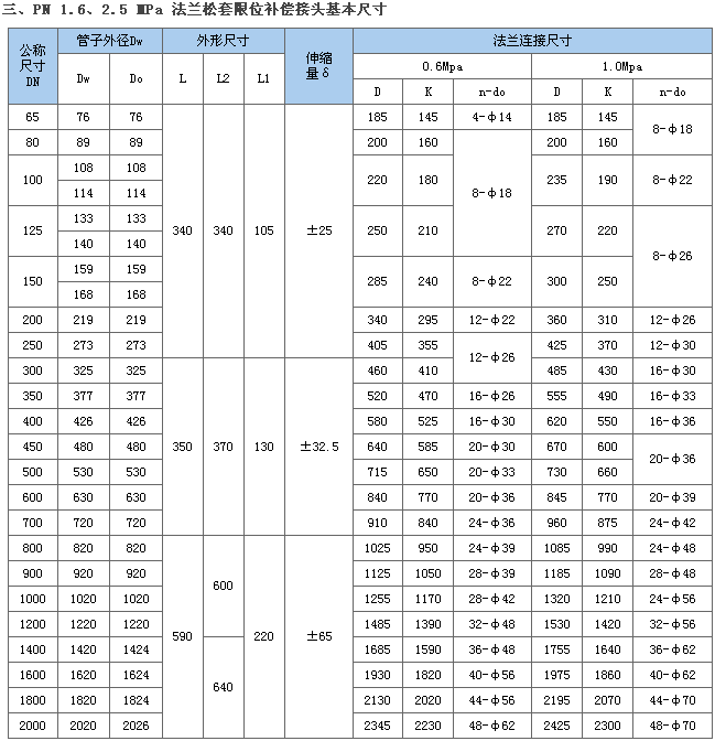 一、性能待点 法兰松套限位补偿接头是在AF型法兰松套补偿接头的基础上増设限位伸缩管及限位螺柱而成,最大伸缩量处用双螺母锁定,补偿因热胀冷缩和地基沉降引起的管线轴向位移及挠曲和偏心,从而保护阀门的设备。根据连接方式的不同分为单法兰松割限位补偿接头和双法兰松套限位补偿接头。