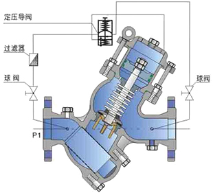 YQ98002过滤活塞式安全泄压阀是一种利用介质自身能量来调节与控制管路压力的智能型阀门。当过滤活塞式安全泄压阀从进口端给水时,水流过针阀进入主阀控制室,出口压力通过导管作用到导阀上;当出口压力高于导阀弹簧设定值时,导阀关闭,控制室停止排水,此时主阀控制室内压力升高并关闭主阀,出口压力不再升高。当过滤活塞式安全泄压阀出口压力降到导阀弹簧设定压力时,导阀开启,控制室向下游排水。由于导阀系统排水量大于针阀的进水量,主阀控制室压力下降,进口压力使主阀开启。在稳定状态下,控制室进水、排水相同,主阀开度不变,出口压力稳定。出口压力不因进口压力变化而改变,亦不因主阀出口流量的变化而改变,安全可靠地将出口压力维持在设定值上。压力等级:PN10(调节范围0.3-0.9Mpa),PN16(调节范围0.5-1.4Mpa),PN25(调节范围0.5-2.4Mpa)。